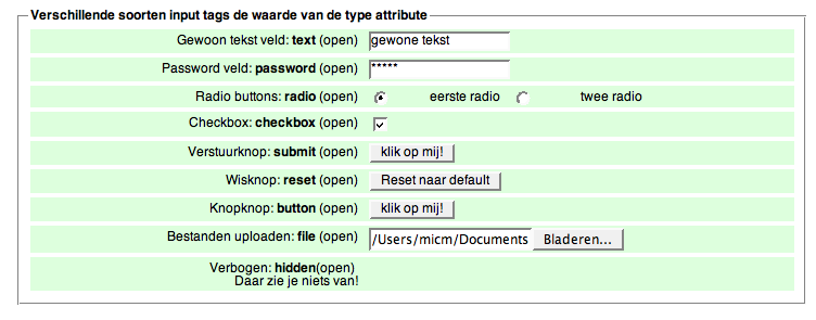 Dit zijn gewonen text doorgeefvelden. Het enige verschil is dat de weergave per type verschilt: Hiddens lijken raar op eerste gezicht echter kunnen behulpzaam zijn bij het doorgeven van data waar de gebruiker niets mee te maken heeft of bijvoorbeeld meerdere stappen formuleren waar bij je velden die reeds zijn ingevuld moeten onthouden worden. (voor die laatste zijn ook ander mogelijkheden beschikbaar).