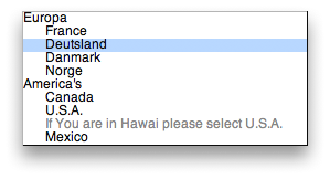 <option disabled> If You are in Hawai please select U.S.A.</option>