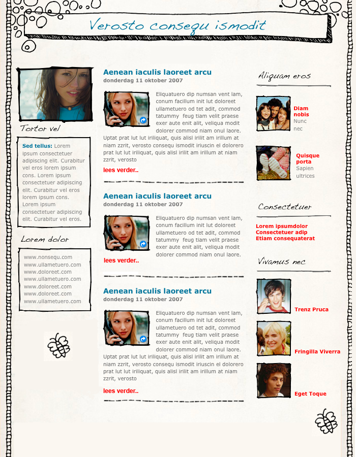 - Kolom 2 bevat een afbeelding en tekst. Daaronder is ruimte voor vier berichten met een foto bij elk bericht. Elke bericht heeft zijn eigen kader met een grijslijntje.