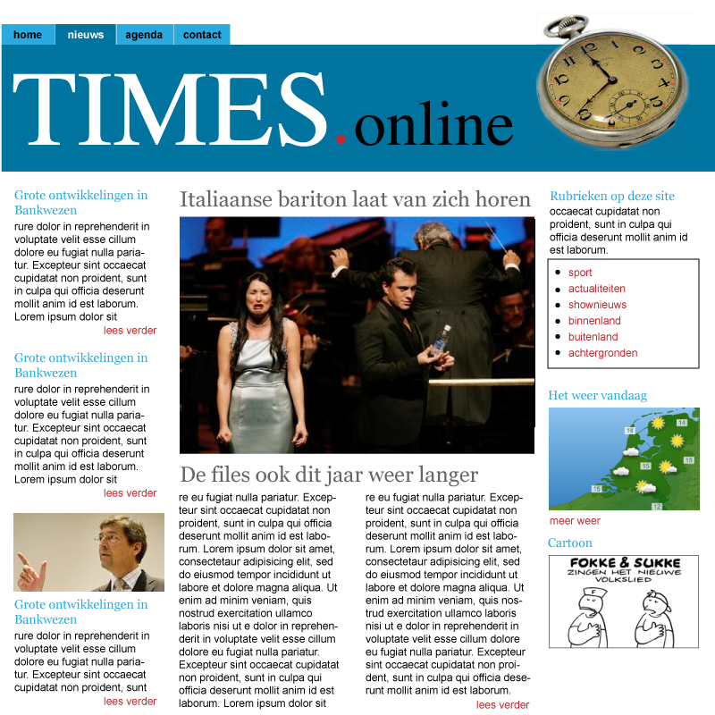 - Midden een uitgebreid nieuwsbericht , grote foto en de tekst in twee kolomen. Deze colom bevat hoofdtitels. Denk aan onderschrift foto.