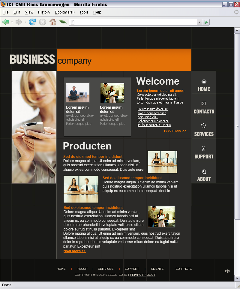- Links een menu naar de belangrijkste catagorieen op de website, koppen en twee afbeeldingen. Deze colom bevat subtitels.