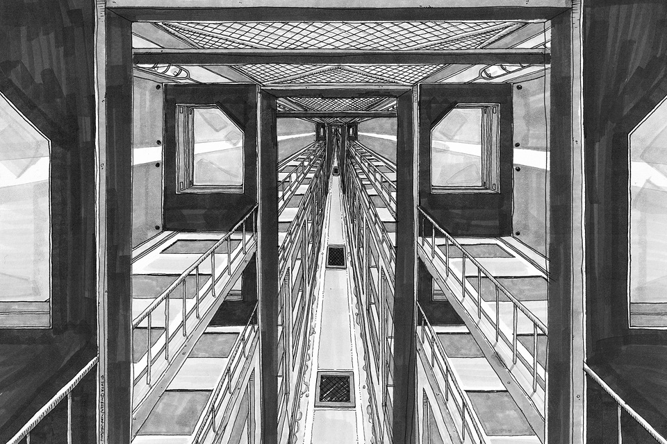 Maak een totaal uitgewerkte tekening van een ''sciencefictionachtige" binnenruimte